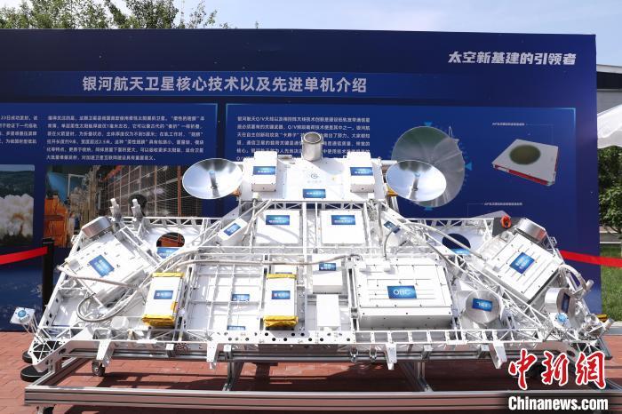 银河航天方舟实验室展出灵犀03号卫星主体模型。据介绍,银河航天灵犀03星是中国首款使用柔性太阳翼的卫星,于2023年7月23日成功发射。中新社记者 王紫儒 摄
