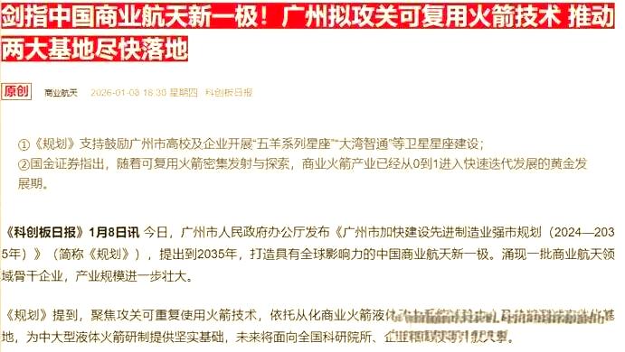 广州市人民政府办公厅于2026年1月8日发布了《广州市加快建设先进制造业强市规划(2024—2035年)》。该规划中,广州明确提出要打造全球范围内具有显著影响力的中国商业航天新中心,致力于突破可重复使用火箭技术,并推动两大核心基地的落地建设。这一重大举措如同向商业航天领域注入了强大动力,不仅将推动整个行业的快速进步,也为广州本土的相关企业带来了价值重估的重要机遇。